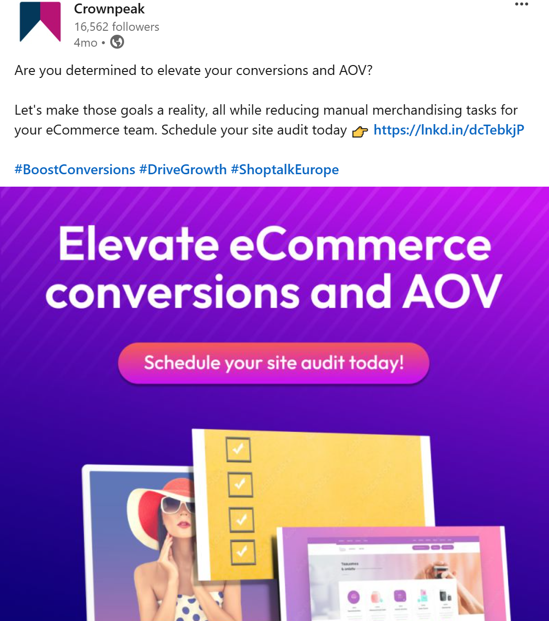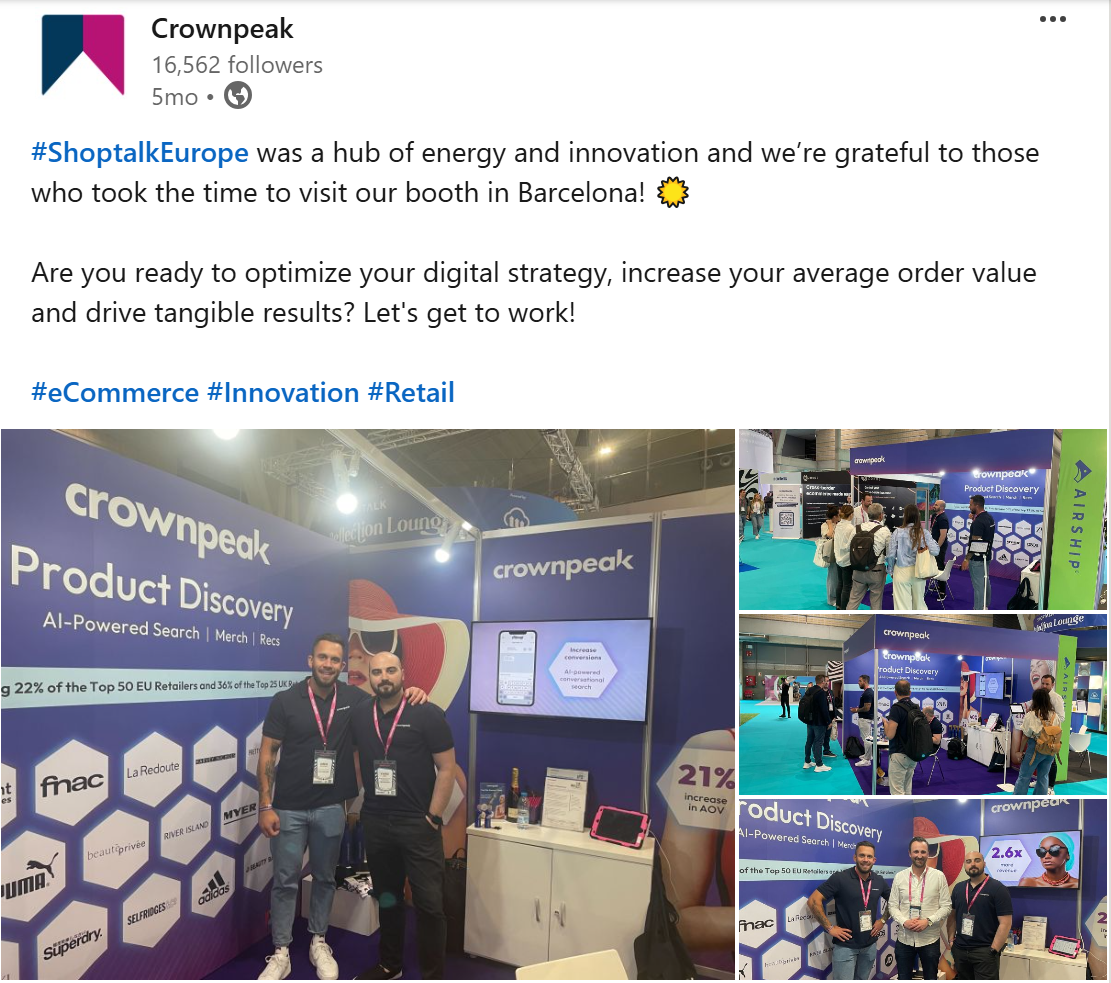 One of my first tasks after joining the marketing team at Crownpeak was to put together email and social content promoting the company’s attendance at one of Europe’s largest retail exhibitions – Shoptalk Europe. The brief was to bring a more playful tone with connotations of the stunning sun-kissed setting in Barcelona, where the event was being held.